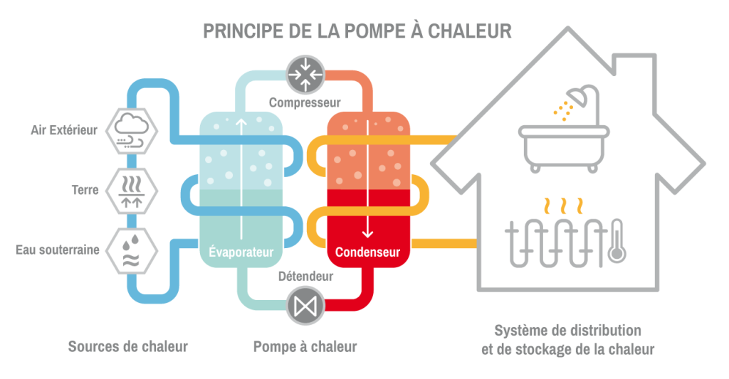 L’installation d’une pompe à chaleur aérothermique permet de capter l’énergie de l’air pour alimenter vos circuits de chauffage et de production d’eau chaude sanitaire, tels que le plancher chauffant, la chaudière thermodynamique, le ballon d’eau chaude, votre piscine, etc.